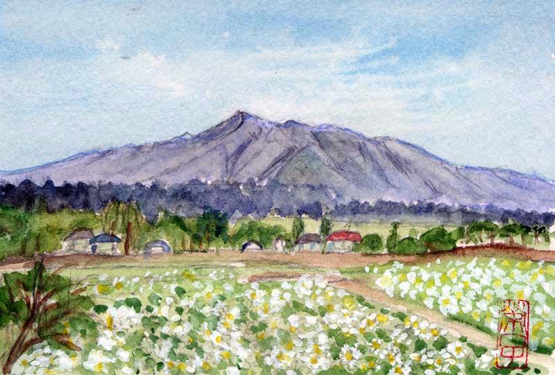 斜里岳を背景にジャガイモの花が咲いているというイメージです。
